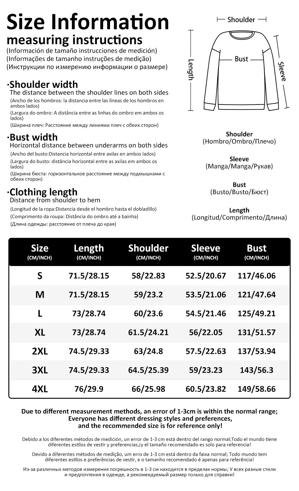 Sizes: S, M, L, 1XL, 2XL, 3XL, 4XL, 5XL, XS